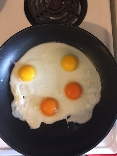 Below photo comparison with two of our Farm Fresh (darker) with two store-bought organic free-run eggs.