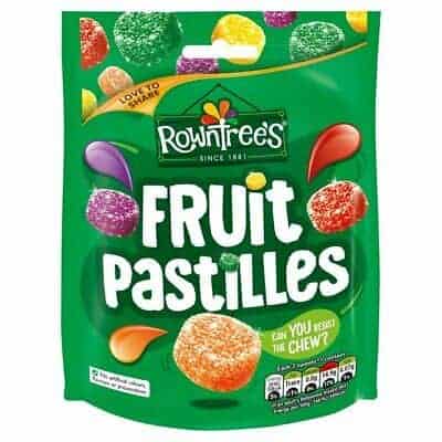 Rowntrees Fruit Pastilles is spot on for those of us who love these tasty fruit sweets. Rowntrees Fruit Pastilles come in five classic flavours – Lemon (yellow), orange (orange), blackcurrant (purple), strawberry (red) and lime (green).